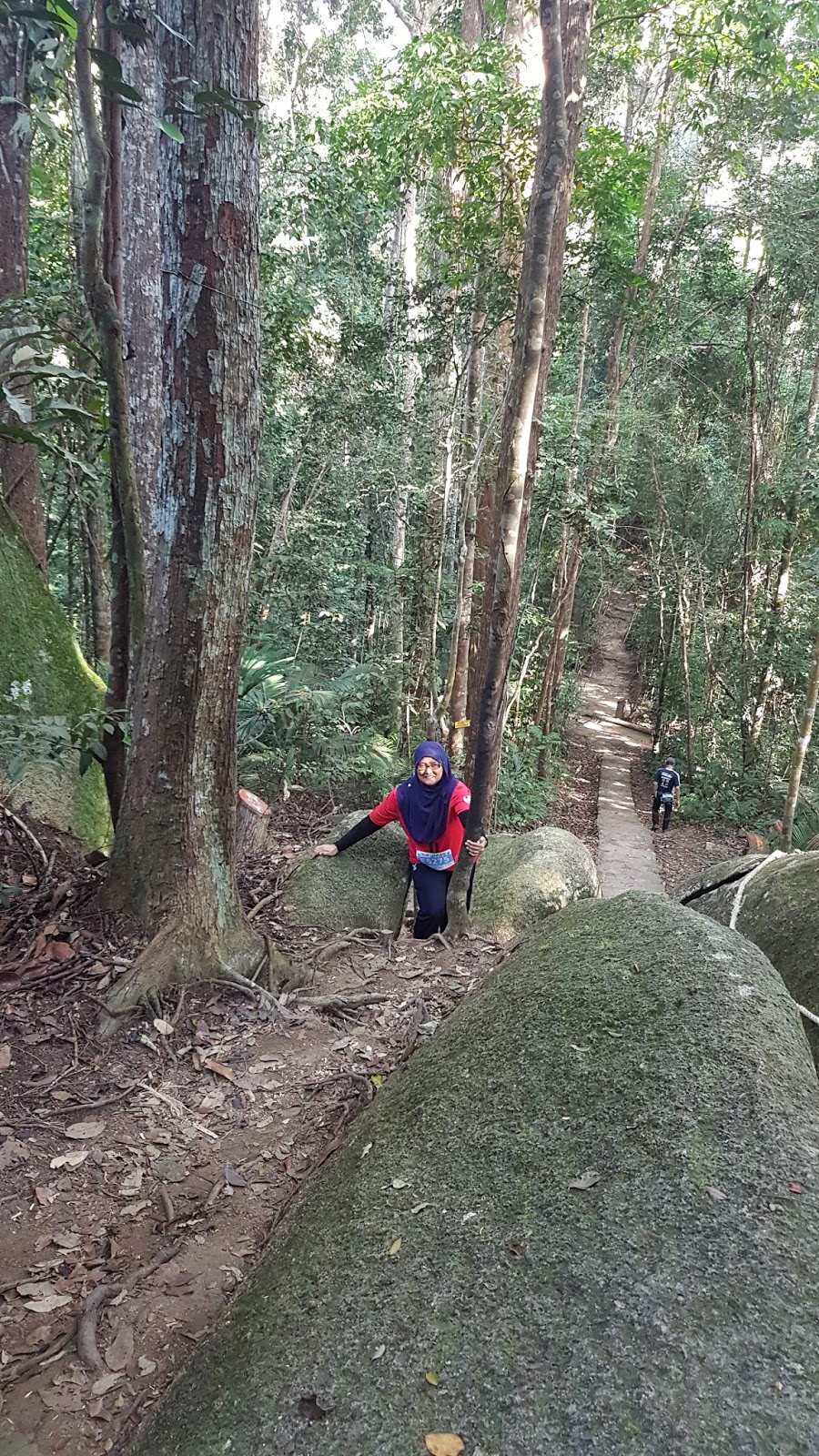 lepas hampir sejam mendaki tu, barulah kami mula masuk ke kawasan dalam hutan...ingat ada water station before masuk hutan, tapi nan hadooo...gila dehydrated...masa ni tak ramai orang dah...aku ngan Cikwi je jalan berdua sambil bergambar...terapi bak kta Cikwi nak elak rasa penat...