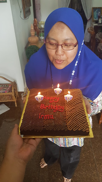 dah kenyang makan tu, tak lama tu Ab sampai dengan bawa brownies yang aku tempah kat area Gombak...kononnya nak surprise kan birthday Irma laaa...surprise hampir gagal sebab Irma meluruuu keluar bila tengok Ab lambat sangat masuk rumah...hahaha...tapi pape pun, berjaya gak laaa buat Irma terkejut sikit...